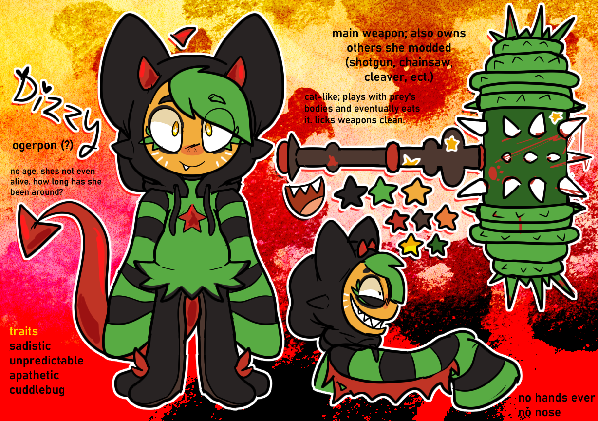 Destructive little shit that goes hunting with Al to kill and maim for food and fun! Dizzy is the devil in your ear telling you to pull the trigger. She died long ago, no one knows how old she is or has been lurking the Earth. Despite being a beast of evil, she likes hamburgers and hanging out with the other littlefurs. She's gentle with them atleast!
