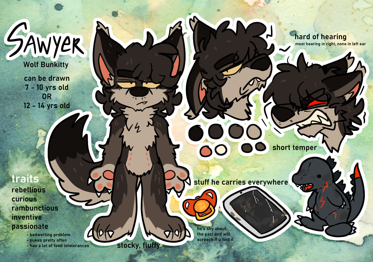 toybox sawyer is pretty much the same as furrealife sawyer. sawyer is pretty consistent across all series he appears in. sawyer is the bio kid of allen and lucas in all universes ^3^